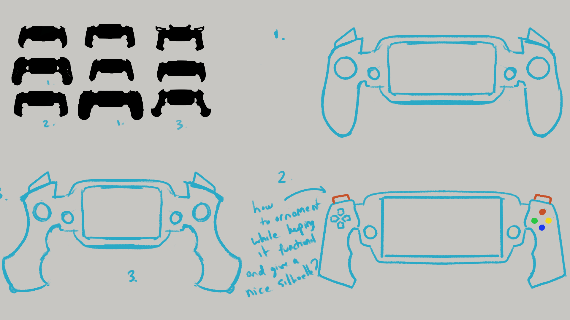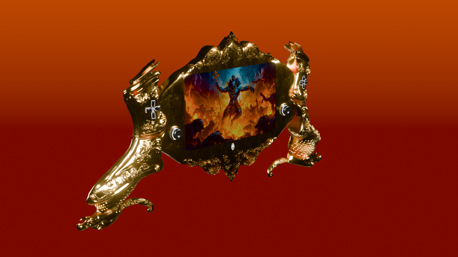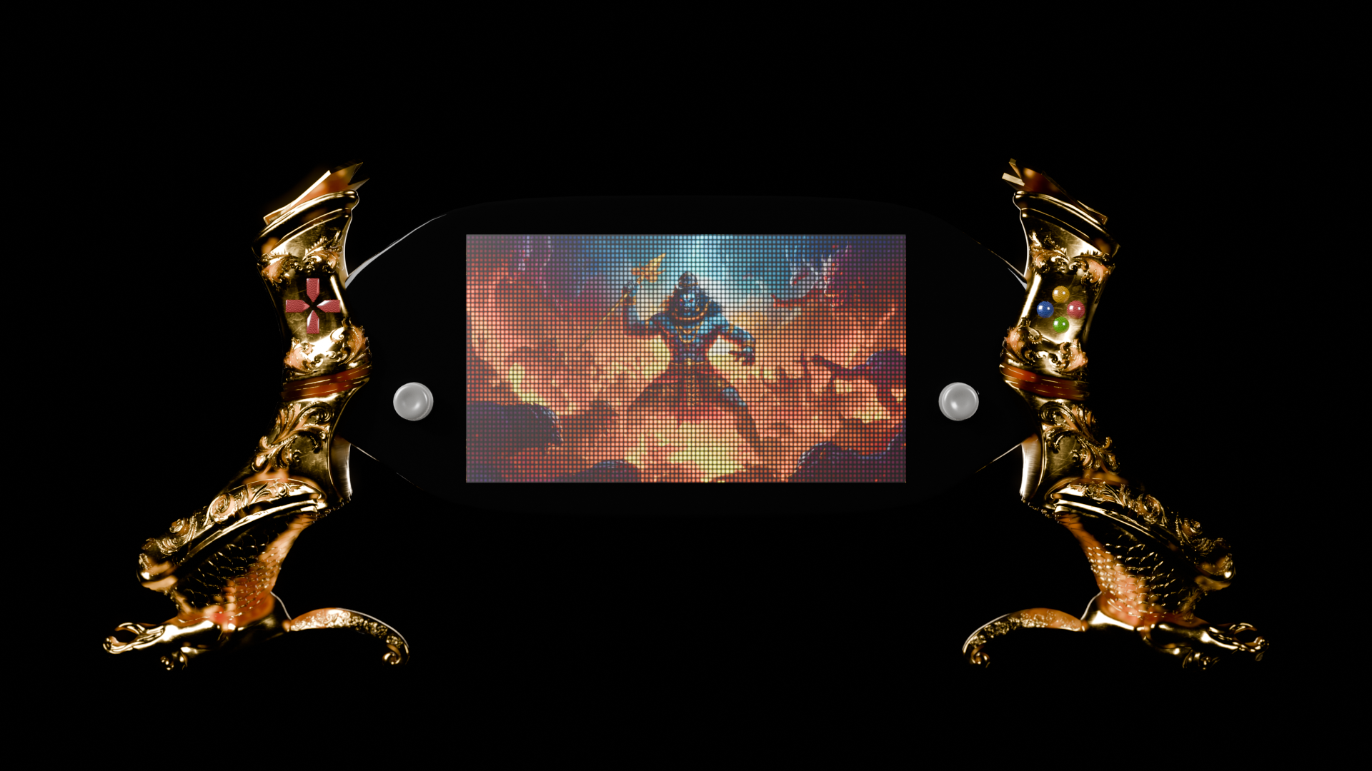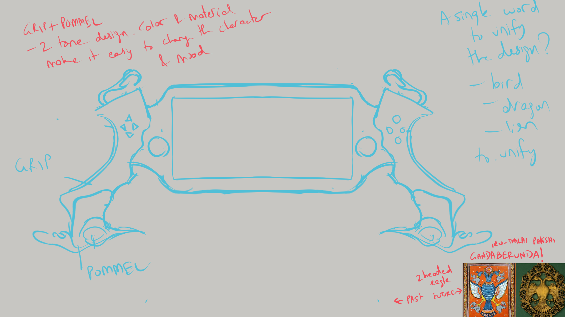 I conceived of the asset as a gaming device designed for use by Indian royals, with the base of a Playstation Portal as reference. And this being a “weapon” to do battle with, I wanted the the grips to take the form of a hilt of a ceremonial sword. The project really cracked open for me when I was able to unify the entire design by taking inspiration from the “Gandabherunda”, a mythical eagle creature with two heads- one that looks to the past and the other to the future, a motivation that resonates with my own work.